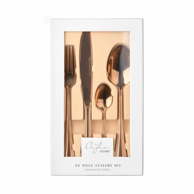 Set the table with this classically elegant Chyka Home Heidy 32 Piece Cutlery Set Antique Copper, boasting a beautiful antique style in a range of metallic colours. Perfect for catching the eye at your next dinner or lunch event, the Heidy cutlery set is the only choice for the regular entertainer! Shop Harris Scarfe’s full range of dinnerware essentials, online and in-store today!