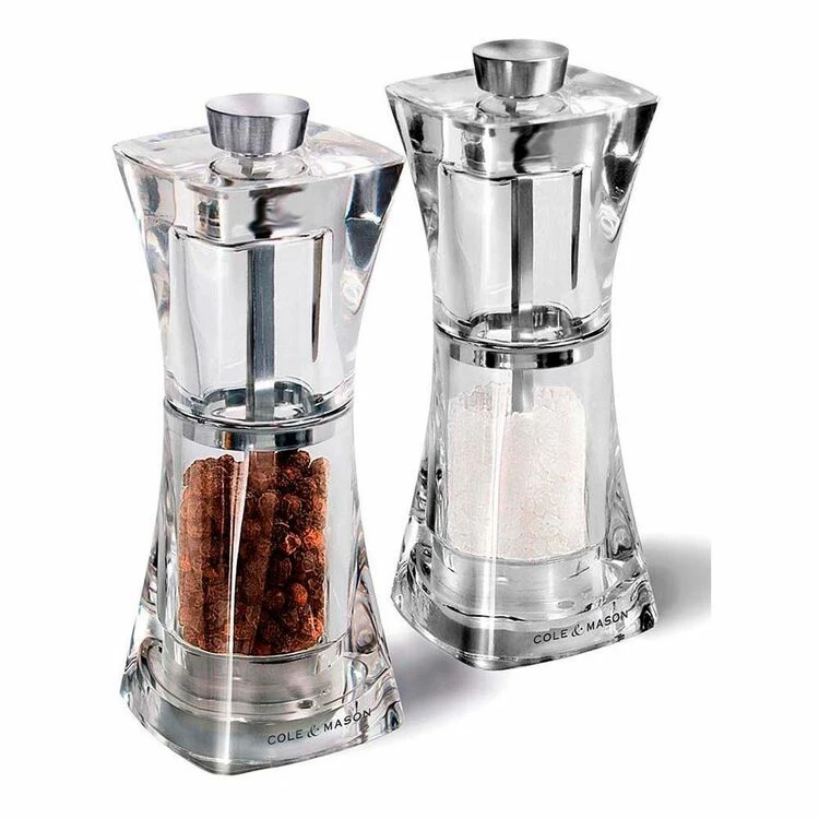 These sleek and slender acrylic mills by Cole and Mason will add a contemporary look to any table, whilst remaining an everyday kitchen tool. The spring-loaded mechanism is adjustable to grind fine to coarse granules. Features a hardened carbon steel mechanism for pepper, and a diamond sharp ceramic mechanism for salt. The Cole and mason precision mechanism does not crush peppercorns, but strips them to release maximum flavour with each turn. The clear body allows you to easily see fill levels.