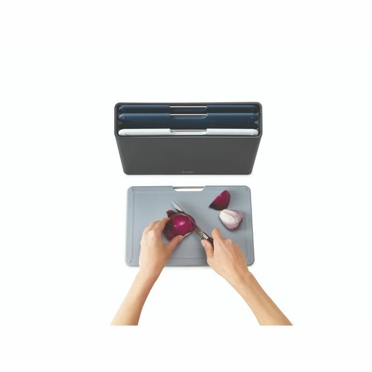 Keep all your chopping board needs beautifully organised with this sleek Joseph Joseph Folio 4 Piece Regular Graphite Chopping Board Set. It features a slimline storage case containing four, large colour-coded boards each with knife-friendly, textured cutting surfaces on both sides and Non-slip feet. The boards themselves can be easily removed from the case due to the smart angled design and their stainless-steel selecting bars. The case holds each board neatly apart, allowing air to circulate, and has non-slip feet on the base. Available in a range of sizes and case colours. Shop the Joseph Joseph range at Harris Scarfe today!