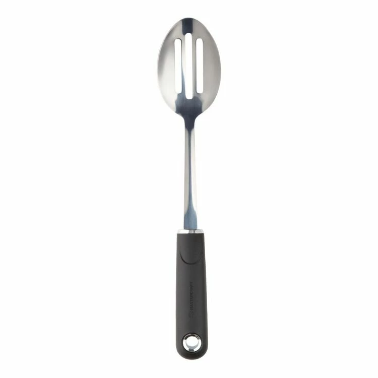 With a slotted design that lets liquids drain away this premium Mastercraft Soft-Grip Slotted Spoon Stainless Steel that is ideal for removing vegetables and meat from fryers and pans or removing hard boiled or poached eggs from boiling water. Designed with the realities of everyday cooking in mind, the sleek MasterCraft soft-touch handle features an ergonomic thumb hold for hand motion control and ultimate grip and balance. It fits perfectly into the hand for complete comfort and confidence when cooking. With a robust stainless steel head that is corrosion, odour and stain resistant.