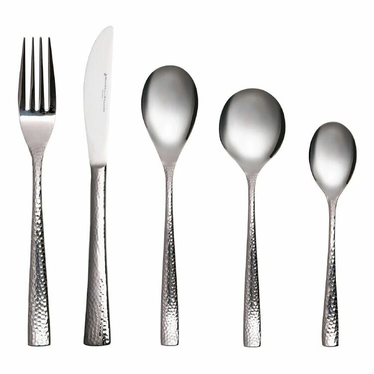 Create gorgeous place settings with the Maxwell & Williams Wayland Hammered Cutlery Set. This 36 piece cutlery set from the Wayland collection features contemporary shapes and a rustic hammered metal design on each handle. Each piece gives off a subtle reflection of light and a lovely tactility in hand. The set includes cutlery for a six person and includes extra six teaspoons.