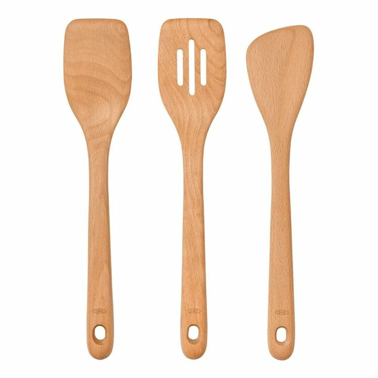 The OXO Good Grips 3-Piece Wooden Turner Set includes OXO’s Slotted Turner, Turner and Sauté Paddle. Use the Turner to turn, lift and transfer foods with ease. The Slotted Turner is ideal for flipping burgers, chicken and grilled cheese. Our Sauté Paddle is a must-have for scraping up browned bits and chopping food directly in pans. The solid, one-piece beechwood construction is sturdy and safe for Non-stick cookware. The OXO Turners have a distinctive straight-sided shape that allows them to reach along the walls and into the corners of your cookware. A natural oil finish protects the wood for long-term use. The large handle is comfortable to grip and has an opening for neat hanging storage. Hand wash only.