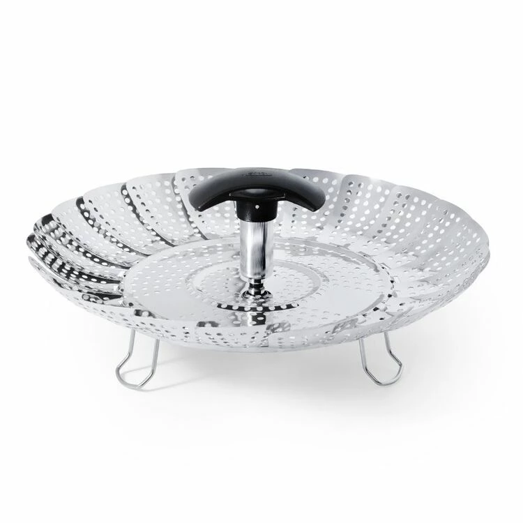 With a simple pull of the OXO Stainless Steel Steamer With Extendable Handle telescoping handle, it extends to provide added length, making it easy and safe to use in hot pots. Press the handle again to lock it down and fold feet in for compact storage. For even more reach, a fork can be inserted into the handle.