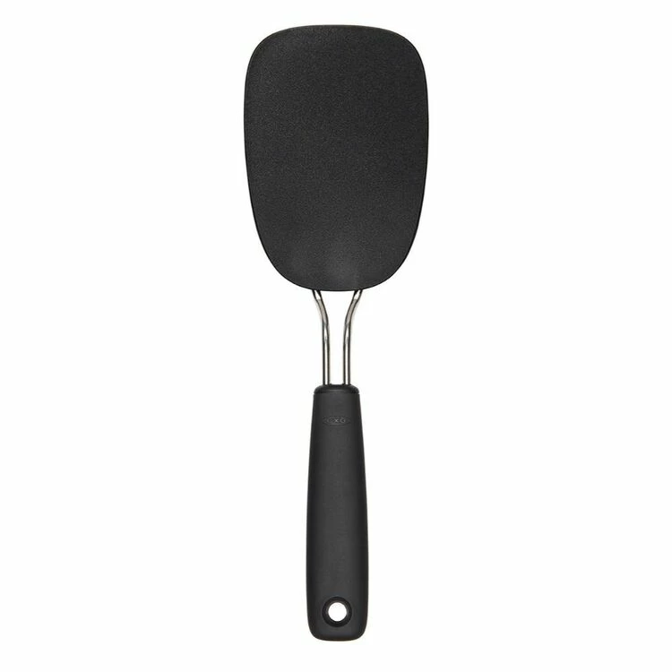 Flips delicate foods with ease, won’t damage non-stick. The OXO Good Grips Large Nylon Flexible Turner is perfect for flipping fragile foods while keeping them intact. Large enough to accommodate fish filets, omelettes, crepes and more. The flexible nylon head easily slides beneath foods in sauté pans or on cookie sheets and is high heat-resistant.