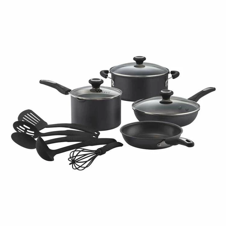 The Raco Power Base 9pc Cookset is the perfect top-quality cookware set that will last you for years! Set containing a stock pot, saucepan, open frying pan and covered frying pan, and a range of nylon utensils. Featuring sturdy, dual riveted handles and a high quality non-stick interior, it’s perfect for cooking up a feast. Plus, the hard anodised construction prevents warping, dents and scratches. And with its stylish matte black exterior finish, this set is sure to add a touch of class to your kitchen. Buy the Raco Power Base 9pc Cookset today at Harris Scarfe!