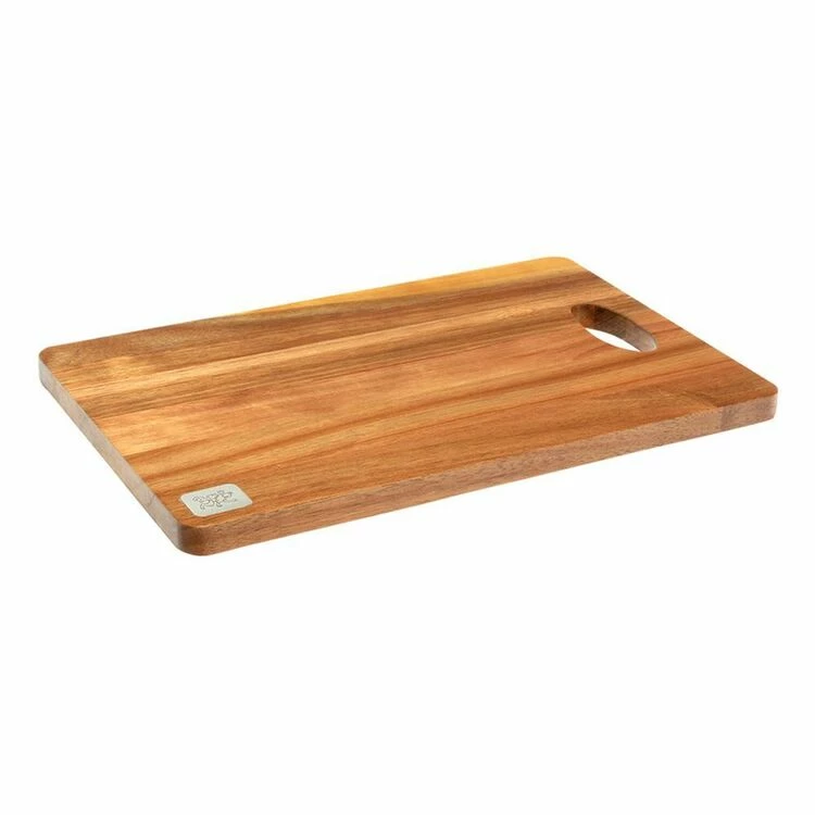 A stable chopping surface is paramount for safe and efficient food prep. This acacia wood board is highly durable and will withstand many years of cutting, slicing and dicing while keeping your knives in good condition. Includes handle hole.