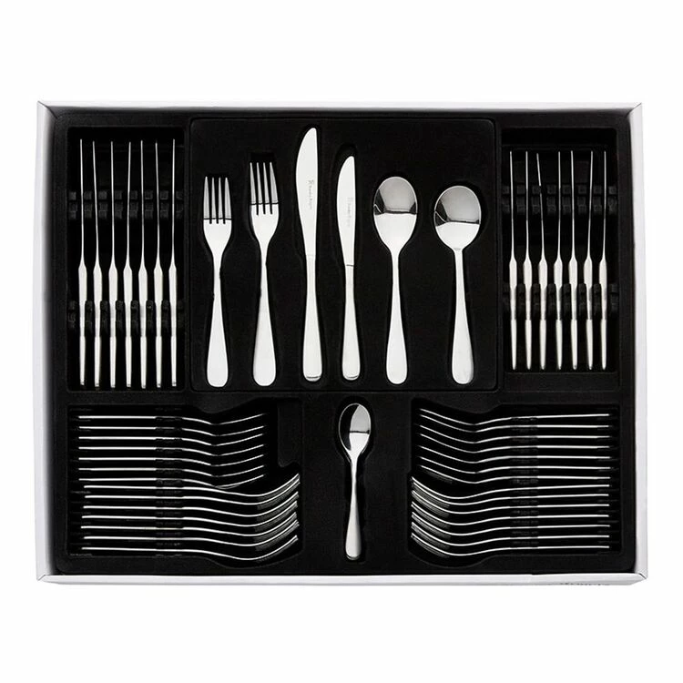 Set contains formal place setting for eight: 8 Dinner Knives, 8 Dinner Forks, 8 Entree Knives, 8 Entree Fork, 8 Dessert Spoons, 8 Soup Spoons, 8 Teaspoons