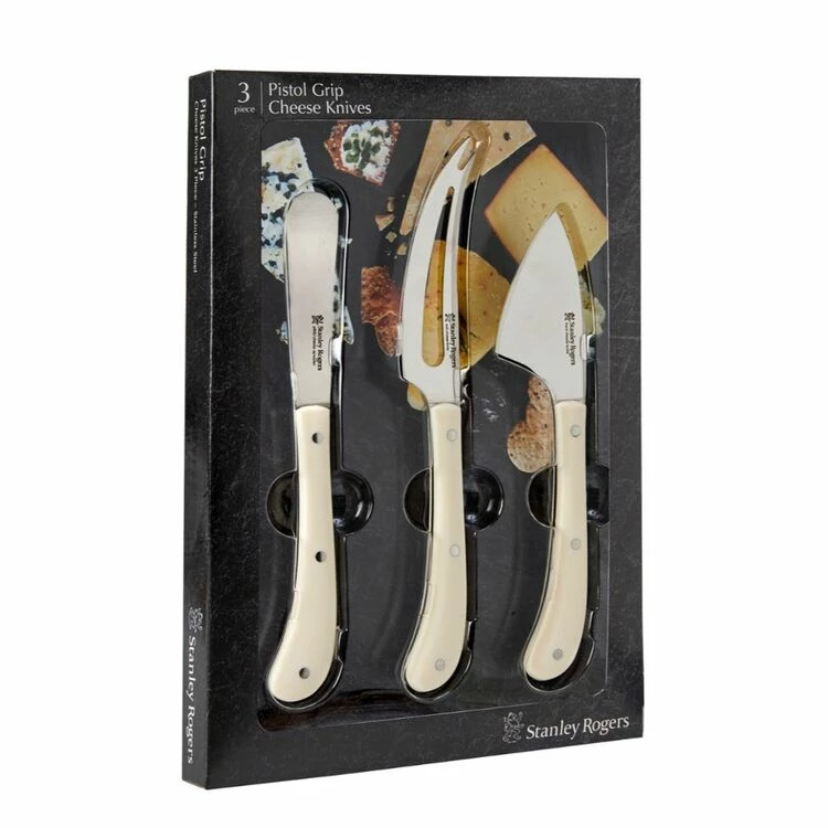 Three versatile cheese knives. The hole in the Soft Cheese Knife reduces sticking, and the arched blade Hard Cheese Knife will cut through with ease. Spreader is perfect for creamy cheese and pâté. The cream handle feels comfortable while adding a nostalgic look to your cheese platter.