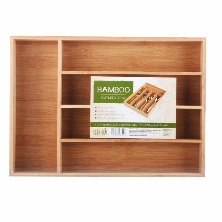 The Tango Bamboo Cutlery Tray is a contemporary storage solution for any kitchen. It features 5 divided sections to store your knives, forks, spoons, and more, with a versatile size designed to fit most kitchen drawers. Made from sustainable yet durable bamboo material, this cutlery tray is practical and guilt-free.