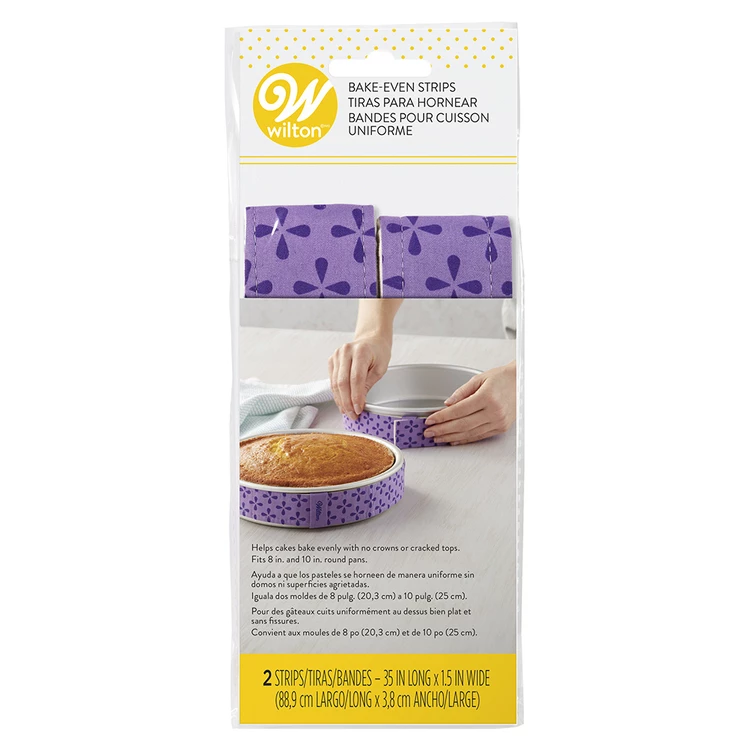 Ever wonder how the pros bake moist, level cakes with no crowns, cracks or crusty edges? They use Bake Even strips. These fabric bands insulate the sides of your cake pan so that your batter cooks evenly. After fitting to your pan, soak strips in cold water, remove excess, wrap around pan and cinch to tighten. You’ll never have to level a cake again.