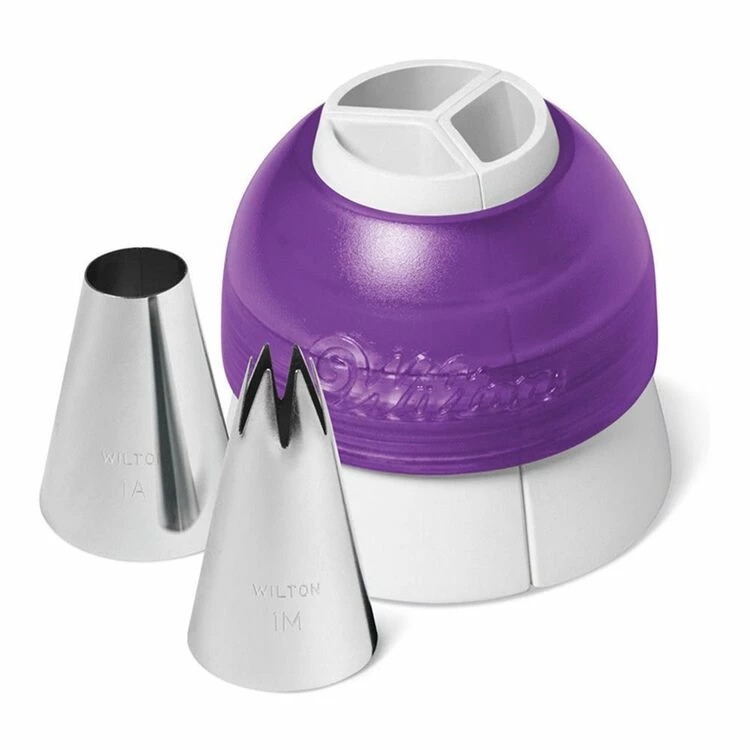 Match your cupcake icing with the right colour combination effortlessly using the Wilton Tri Colour Decorating Set 9 Piece. With three standard piping bags filled with coloured icing, join them together with the special coupler, fit your chosen tip, then have fun swirling. Adding colour to your baked creations has never been easier, thanks to this innovative decorating tool from Wilton.